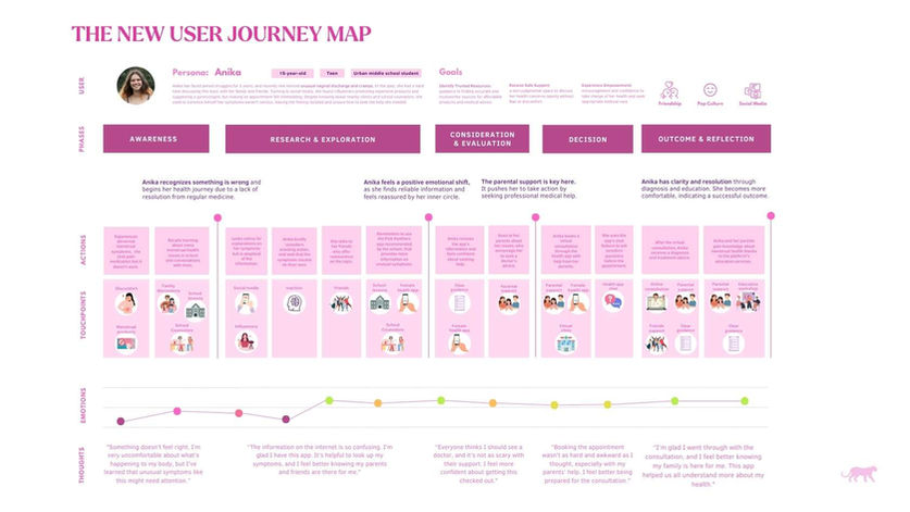 Pink Panthers is a service design project that reimagines menstrual health education through a digital platform. At its center is the Godmother, a trusted mentor guiding teens with clarity and care, supported by interactive tools, resources, and pathways for parents and schools.
